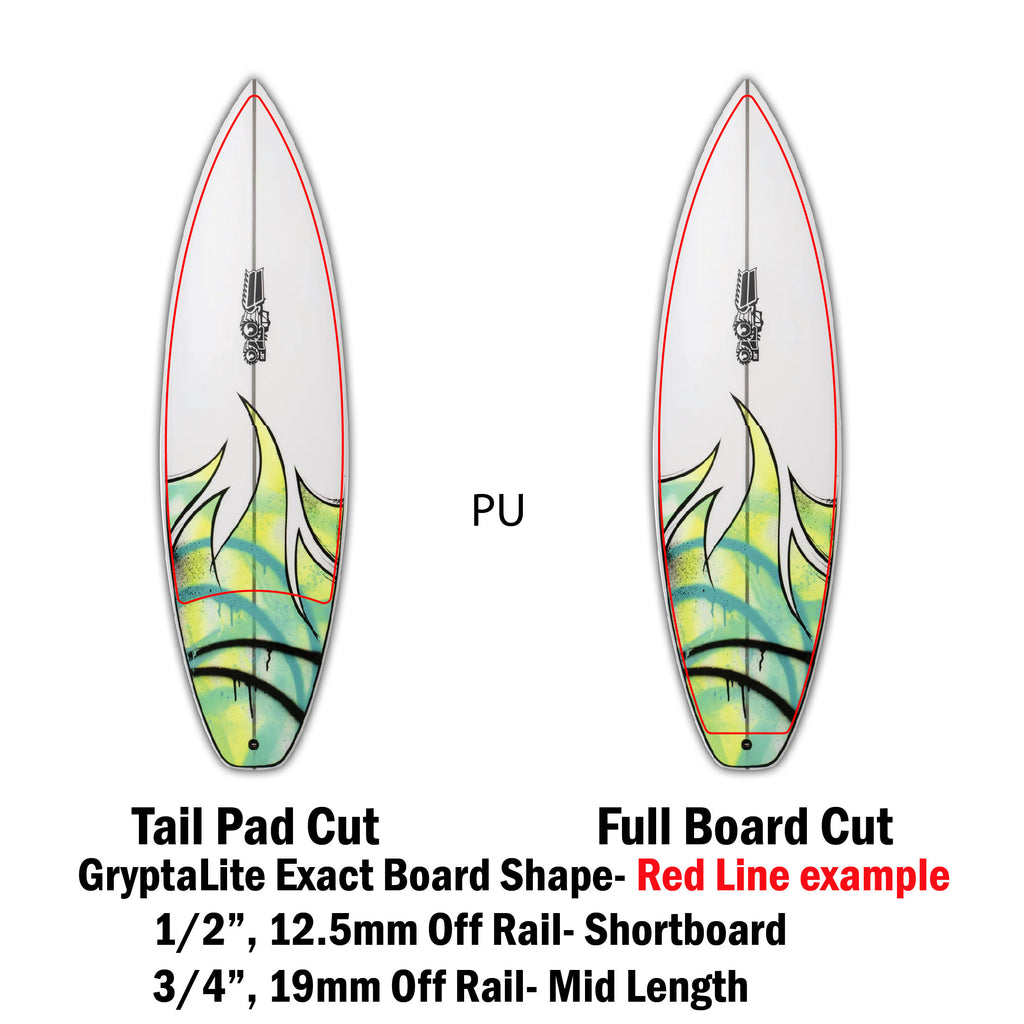 GryptaLite high performance traction has been engineered by surfers, for surfers, providing foot-board control you didn’t know was humanly possible.  No more melted dirty, slippery heavy wax build up.  GryptaLite’s technology is Water Reactive Traction (super grippy when wet), totally transparent, lighter than wax at 1/3 mm thin and performs perfectly in cold and warm water. Clear, Clean and Fast. Once and Done Right- Excellent Traction every surf, for the life of your board and clean ocean health.  Made in USA.